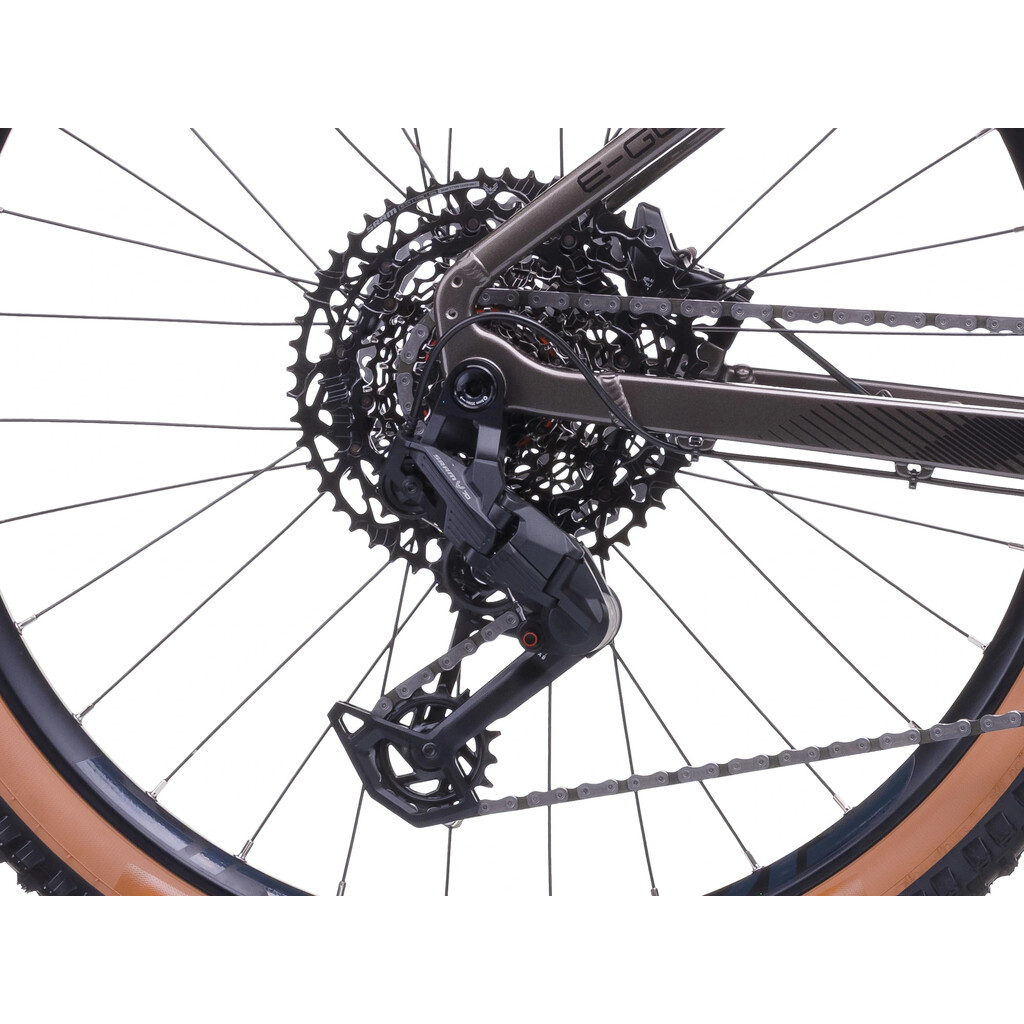 Převody zajišťuje SRAM 70 T-Type Eagle (12 rychlostí) a o brzdný výkon se starají hydraulické kotoučové brzdy SHIMANO Deore.