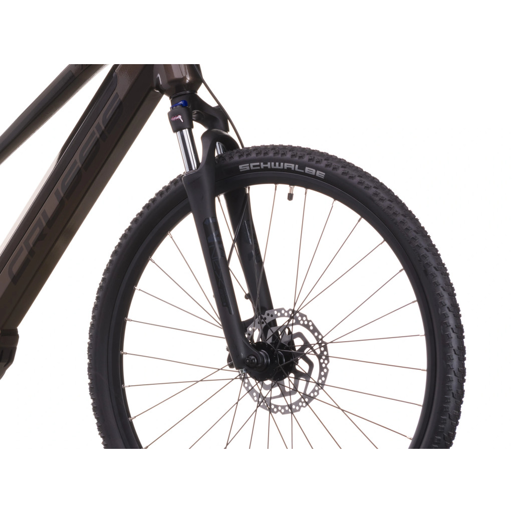 Kolo je osazeno vidlicí SUNTOUR NEX HLO DS 700c s možností uzamčení, která efektivně tlumí nerovnosti, a plášti SCHWALBE Smart Sam, jež obstojí na cyklostezkách i zpevněných lesních cestách. Hydraulické brzdy SHIMANO BR-MT200 přinášejí spolehlivé brzdné vlastnosti ve všech situacích.