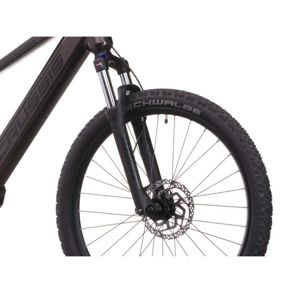 Stabilitu a jistotu i v náročnějším terénu zajišťují hydraulické kotoučové brzdy SHIMANO BR-MT200 a oblíbené pláště SCHWALBE SMART SAM Performance. Pro komfort v členitém terénu je kolo vybaveno odpruženou vidlicí SUNTOUR XCM32 NLO DS 27,5" se zdvihem 100 mm a možností uzamčení.
