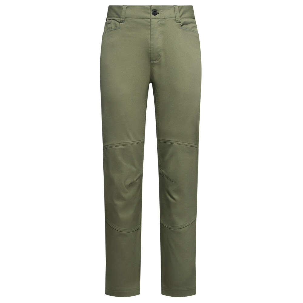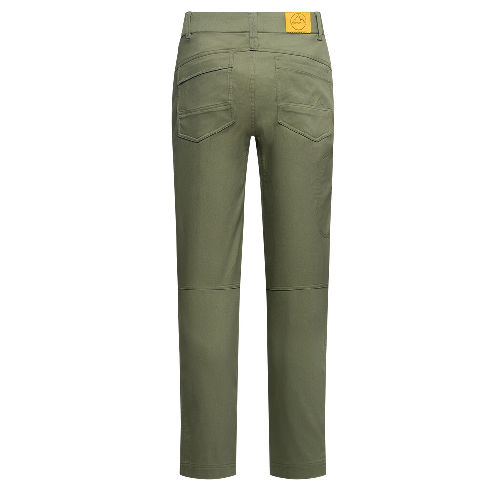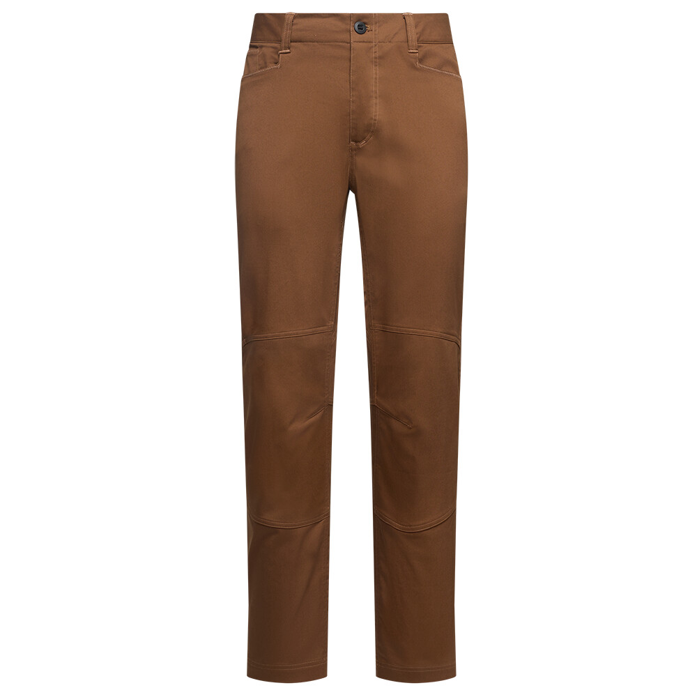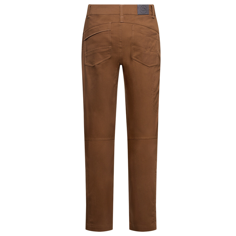 Kalhoty jsou ušité z robustního materiálu z organické bavlněné směsi, který snese drsnější zacházení i kontakt s kamenem. Příměs elastanu a technicky tvarovaný střih přitom zajišťují volnost pohybu. Předtvarovaná a zesílená kolena zvládnou klečení, brousící práce i opakované pokusy v bouldru. Ploché, nízkoprofilové poutko na pásek je pohodlné i pod sedákem a nikde netlačí. Kalhoty nabízí dostatek kapes: kromě klasických předních a zadních kapes je k dispozici i zipová kapsa na stehně. Decentní horský prošev na zadní straně dodává kalhotám nenápadný outdoorový charakter.