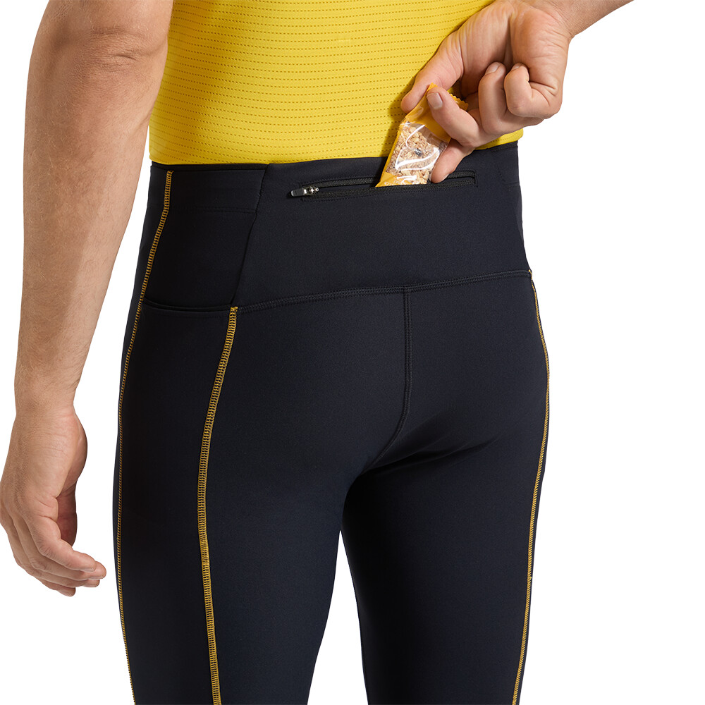 Kalhoty jsou vyrobené z lehkého elastického materiálu, který se přizpůsobí vašemu pohybu a neomezuje při běhu ani dynamických cvičeních. Elastický pas se stahovací šňůrkou umožňuje přesné dotažení podle potřeby, takže legíny zůstávají spolehlivě na místě. Postranní strečové panely zvyšují pohodlí i volnost pohybu. Dvě boční „drop-in“ kapsy s elastickým lemem bezpečně podrží telefon, gel nebo čepici, zatímco zadní kapsa na zip je ideální na klíče či drobnosti, které nechcete ztratit. Reflexní logo na lýtku zlepšuje viditelnost při běhu za šera.