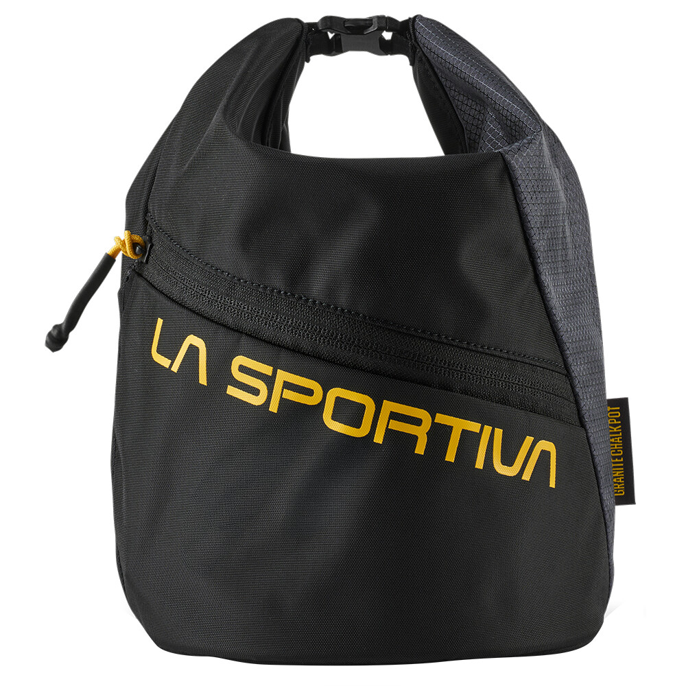 Vak na magnézium Granite Chalk Pot od značky La Sportiva pro bouldering. Sáček je vyroben z recyklovaného nylonu HT Robic X Grid s UHMWPE 210, jedná se o odolný a ekologický materiál. Vak má roll-top uzávěr zajištěný magnetem a sponou, který spolehlivě chrání obsah před vysypáním. Otvory ve tvaru kosočtverce usnadňují používání magnézia, základna vaku má pevný rám pro větší stabiliktu. Sáček je vybaven dvěma elastickými úchyty na kartáče, což je praktické při používání. Pro uložení drobností jako klíče aj. slouží vnější kapsa se zipem YKK®.