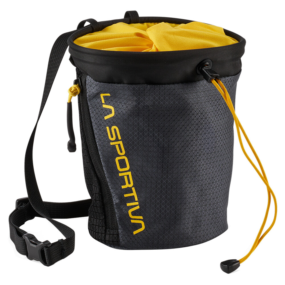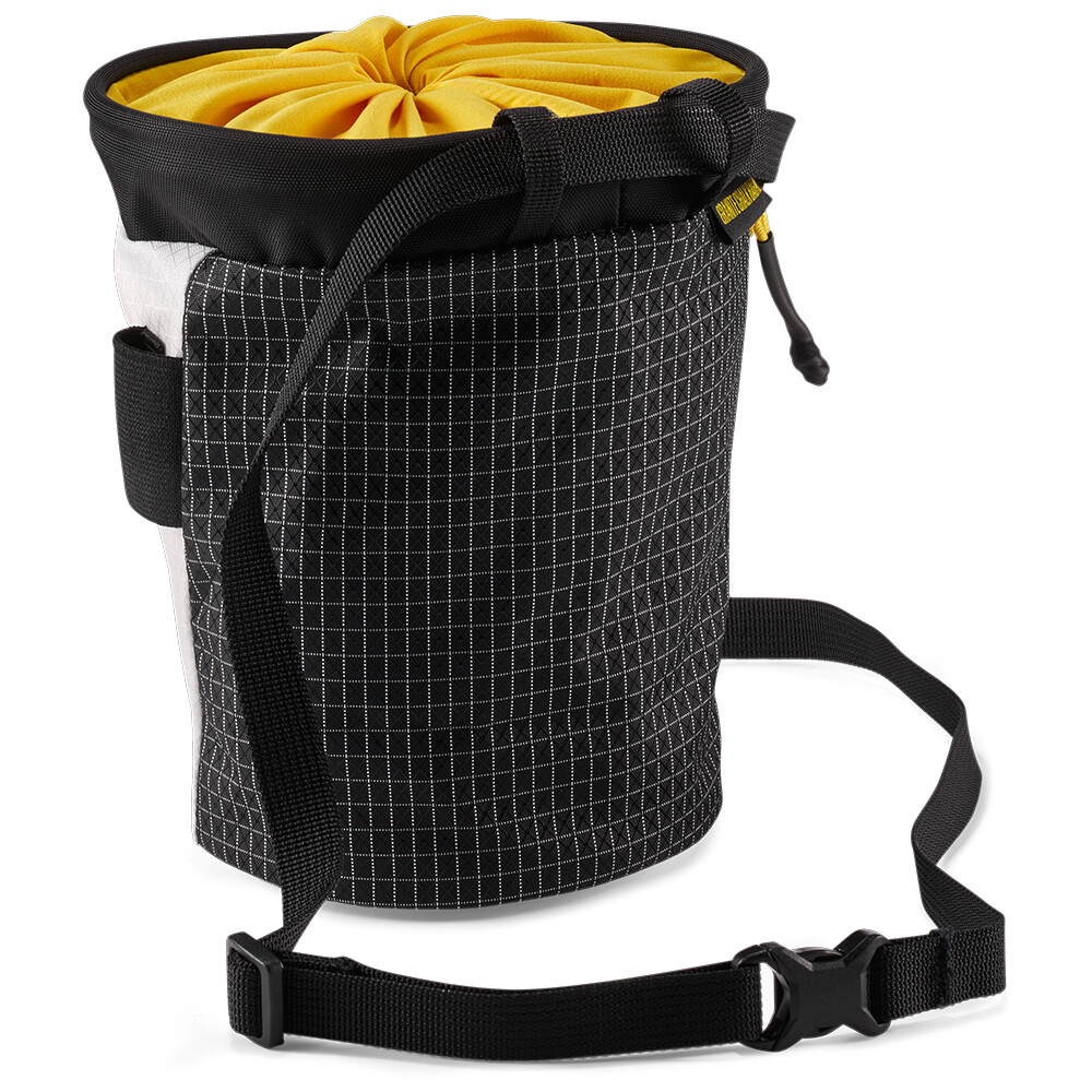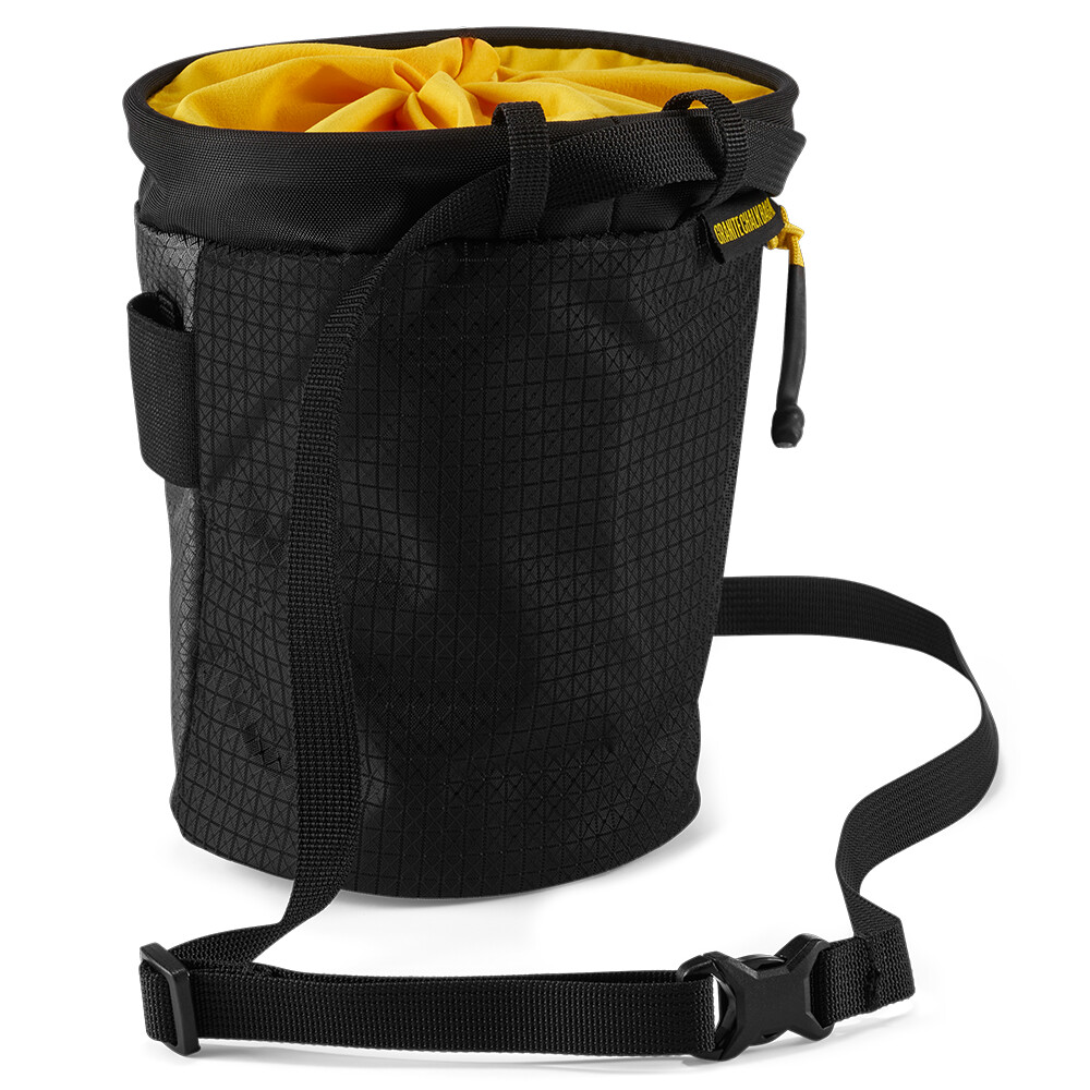 Sáček na mágo Granite Pro Chalk Bag od italské značky La Sportiva, který je vyroben z odolné a pevné tkaniny HT nylon Robic X Grid. Tuto tkaninu UHMWPE 210 používá značka La Sportiva k výrobě svých lezeckých batohů. Materiál pochází z recyklovaných zbytků. Pevný rám ve dně pytlíku umožňuje jeho stabilní postavení na podlahu během boulderingu. Pásek kolem pasu slouží k jeho zavěšení během kezení na laně.