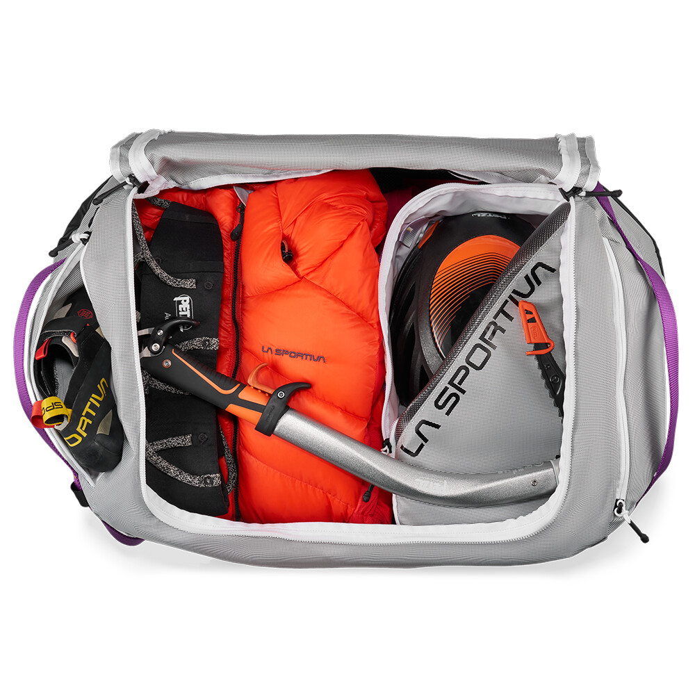 Nomad 70L od značky La Sportiva je cestovní taška vyrobená z vysoce odolného materiálu. Její velkou výhodou je možnost nesení přes rameno nebo na zádech, jako klasický batoh. Ramenní popruhy jsou nastavitelné a navíc je můžete zcela schovat do jejich vlastní kapsy. Uvnitř najdete dvě síťované kapsy na drobnosti a z vnější části je kapsa na zip, která se výborně hodí na věci, které chcete mít po ruce (letenky, doklady, telefon, powerbanku). Součástí je také obal na boty nebo jiné vybavení, které chcete "čistě" zabalit.