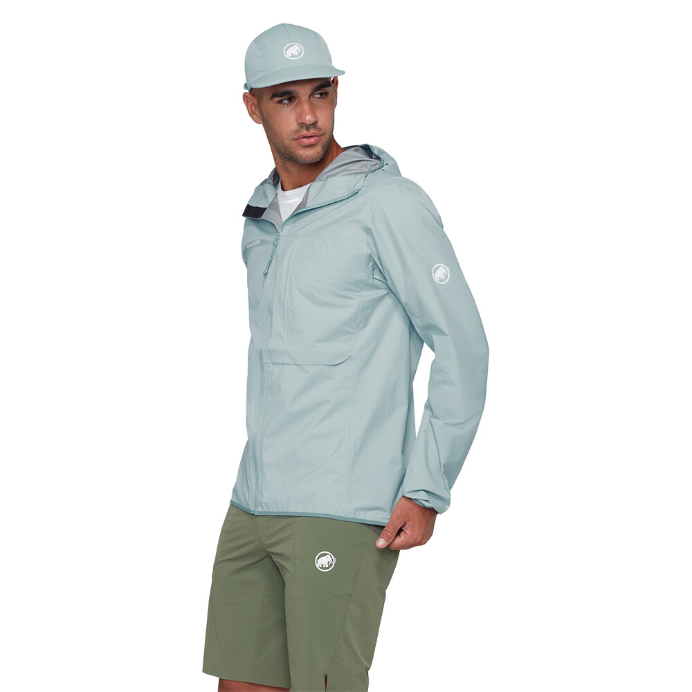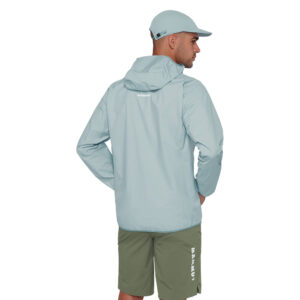 Bunda je vyrobena z membrány Mammut DRY Active. Díky tomu je nepromokavá, prodyšná a větruodolná. Patent na hrudi umožní otevření centrálního zipu a regulaci teploty při zvýšené fyzické aktivitě. Předtvarovaná kapuce skvěle sedne. Předtvarované rukávy jsou doplněny o elastické manžety. Vnitřní kapsa disponuje většími rozměry. Švy na ramenou jsou umístěny tak, aby nepřekážely při použití s batohem. Spodní lem je elastický. Bundu jednoduše sbalíte do hrudní kapsy.