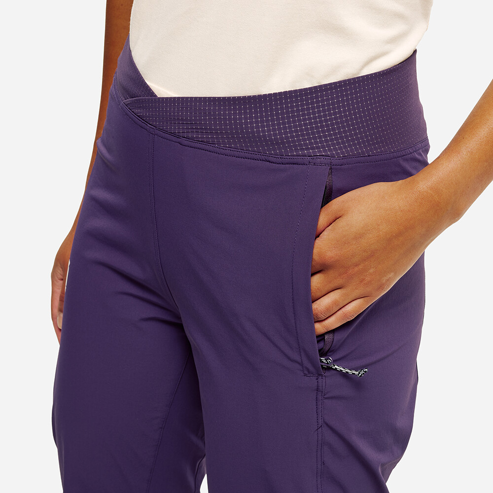 Střih typu carrot se zúženými nohavicemi podporuje plynulý pohyb a přirozenou práci nohou při technických pasážích. Vodoodpudivě upravený čtyřsměrně strečový materiál zajišťuje odolnost i flexibilitu, zatímco klín v rozkroku zvyšuje komfort při širokých krocích a výstupech. Plochý elastický pas překrývající se v přední části je plně kompatibilní s lezeckým úvazkem. Dvě zipové kapsy umožňují bezpečné uložení drobností a elastické zakončení nohavic udržuje kalhoty na místě i při náročném lezení.